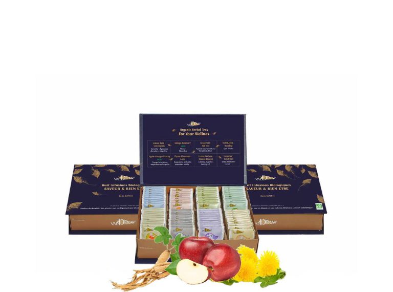 2. Valdena Blue box Organic Tea Gift Set: This gift set includes 8 different flavors of organic tea, all of which are packaged in tea bags. The set includes; Lemongrass – Lemon Balm tea organic, Thyme – Cinnamon – Anise, Grapefruit – Ash Tree, Lime Tree – Mint, Lemon Verbena – Orange Flowers, Harpagophytum – Meadowsweet, Fennel – Nettle – Cactus, Licorice – Dandelion. For more info click >
