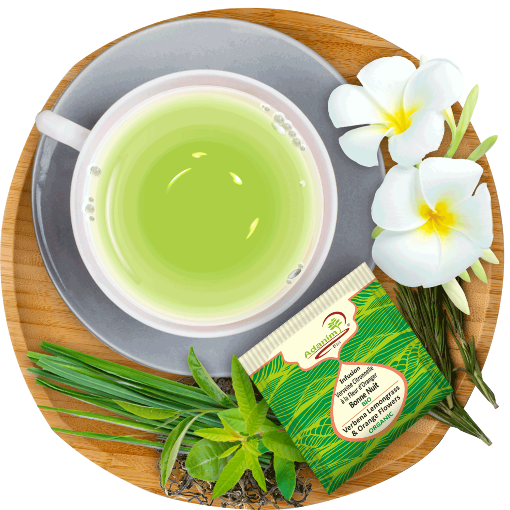 Lemon verbena, lemongrass, and orange flowers infusion herbal tea! This fragrant and flavorful, refreshing, and zesty tea is perfect for sipping before bedtime, Made with all-natural ingredients that are known to promote relaxation and improve sleep quality, this tea is also free of caffeine, so you can enjoy it without worrying about being kept up at night.